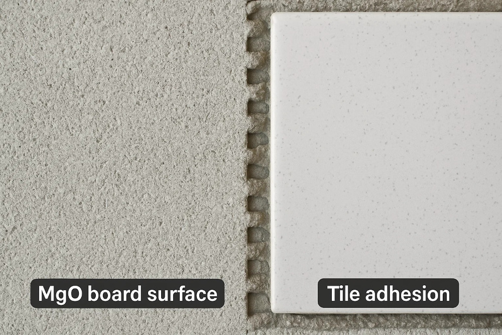 両方のボードは、タイル接着に優れた表面を提供します。主な違いはメソッドにあります。セメントボードの多孔質の性質により、薄いセットのモルタルが表面に硬化するときに機械的に結合することができます。一部のメーカーは、表面をプライミングして吸収性を低下させ、薄いセットがあまりにも速く乾燥するのを防ぐことを推奨しています。これにより、結合が弱くなる可能性があります。 MGOボードの滑らかで密な表面は、薄いセットを備えた強力な化学結合を提供し、タイルが長年にわたって安全かつ持続することを保証します。