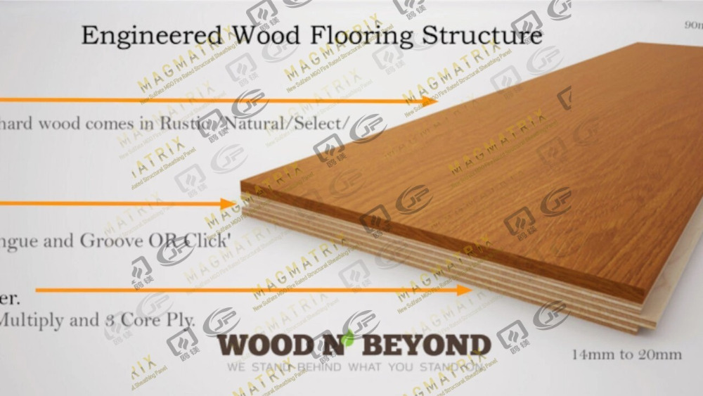 交差粒パターンで結合した複数の層は、寸法の安定性を改善するエンジニアリング木材を構成します。構造には、いくつかの合板層に接続された本物の木材ベニアの上層(厚さ2〜5mm)があります。このユニークな構造は、固体木材よりも強力で硬い製品を作成します。ほとんどの製品には、舌と溝の縁が付いています。多くのメーカーは現在、クリックロックシステムを使用してインストールを容易にしています。