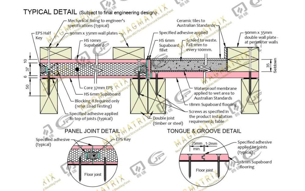 これらを作りました MGOサブフロアパネル 酸化マグネシウムと非有機鉱物および添加物を組み合わせることにより。それらはグラスファイバーメッシュで強化され、それらを長持ちさせます。ほとんどのビルダーは、厚さ3/4 "の構造パネルを選択します - 強い、持続する床にぴったりです。パネルは舌と溝の端でロックします。